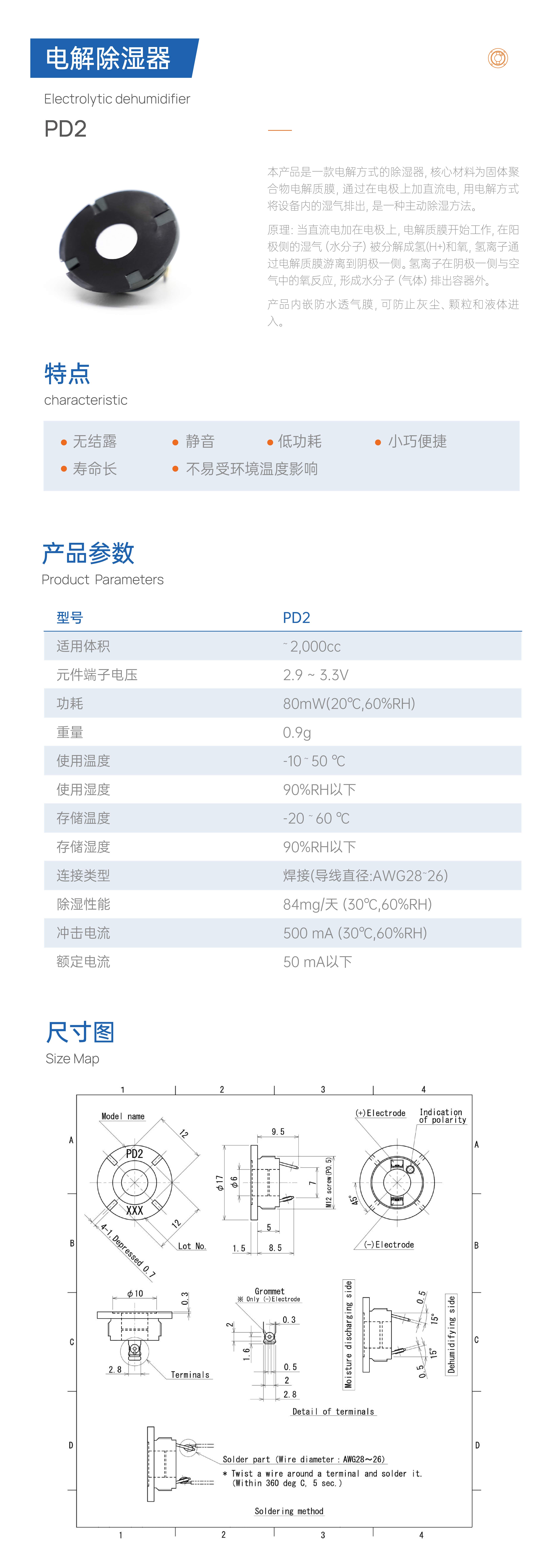 本產(chǎn)品是一款電解方式的除濕器,核心材料為固體聚合物電解質(zhì)膜,通過在電極上加直流電,用電解方式將設(shè)備內(nèi)的濕氣排出,是一種主動除濕方法,原理:當(dāng)直流電加在電極上,電解質(zhì)膜開始工作在陽極側(cè)的濕氣(水分子)被分解成氫(H+)和氧氫離子通過電解質(zhì)膜游離到陰極一側(cè)。氫離子在陰極一側(cè)與空氣中的氧反應(yīng),形成水分子(氣體)排出容器外。