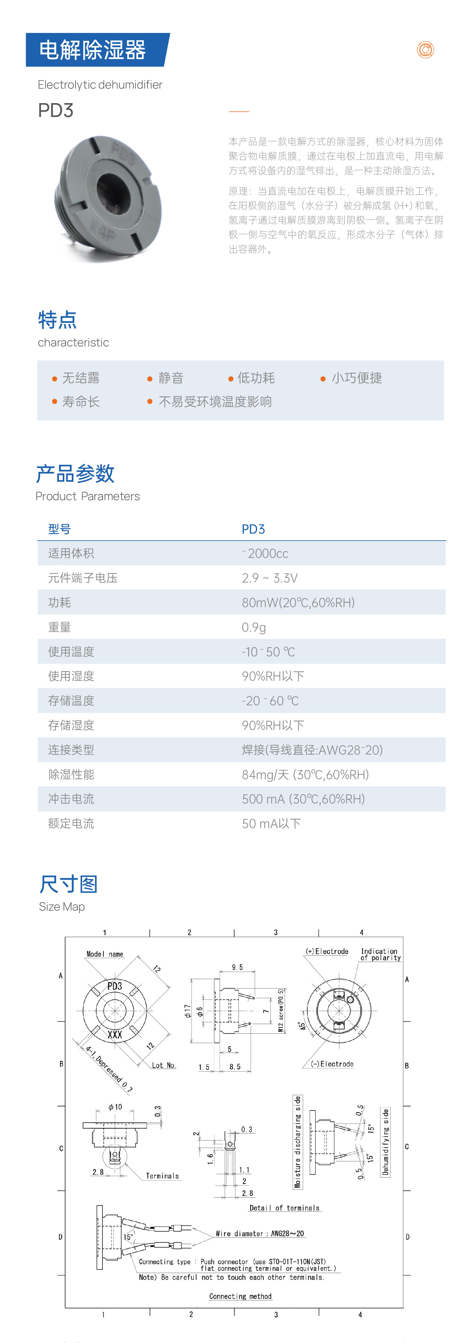 本產(chǎn)品是一款電解方式的除濕器,核心材料為固體聚合物電解質(zhì)膜,通過在電極上加直流電,用電解方式將設(shè)備內(nèi)的濕氣排出,是一種主動(dòng)除濕方法,原理:當(dāng)直流電加在電極上,電解質(zhì)膜開始工作在陽極側(cè)的濕氣(水分子)被分解成氫(H+)和氧氫離子通過電解質(zhì)膜游離到陰極一側(cè)。氫離子在陰極一側(cè)與空氣中的氧反應(yīng),形成水分子(氣體)排出容器外。